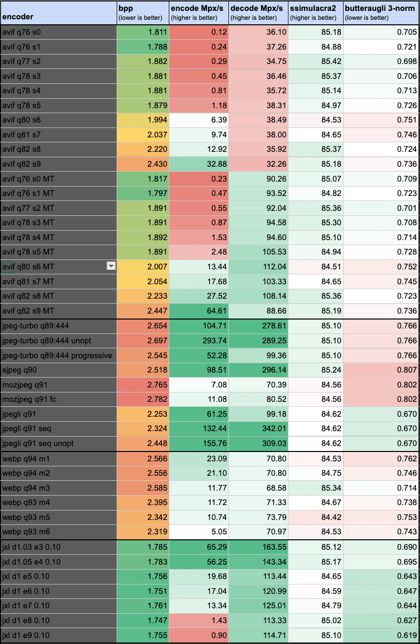 AVIF: Better than JPEG probably, but encoders for AV1 are currently heavily biased towards blurring, even at very high bitrates. Non-Chrome browser support took a while.