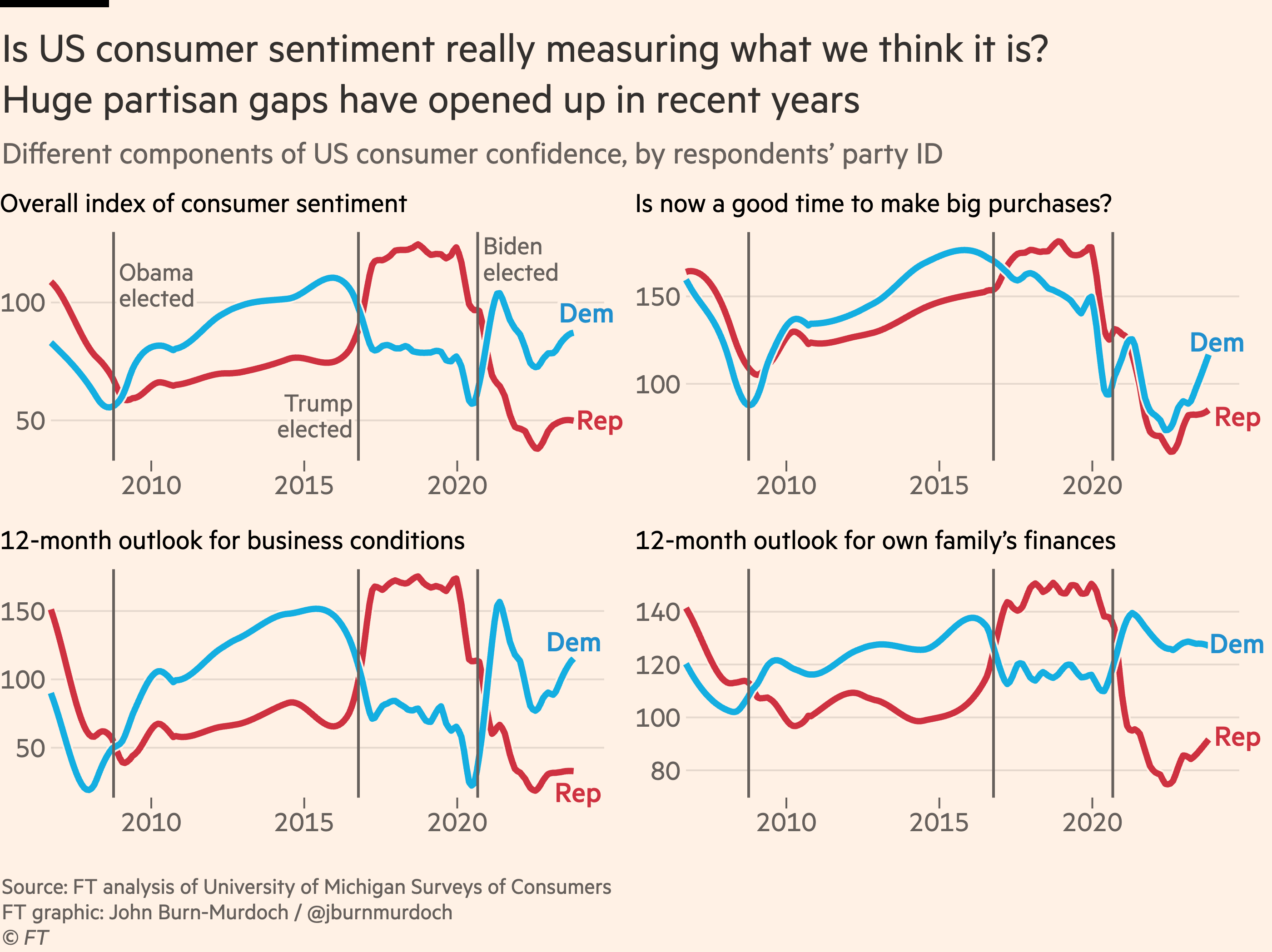 Really? The divergence in 2016 suggests it was also caused by partisanship on the part of media consumers. While it might be tempting to blame republicans for the divergence, the fact that there was a sudden spike for democrats suggest it was purely partisanship, similar to how different parties' perception of the economy diverges depending on whether their party is in power or not.