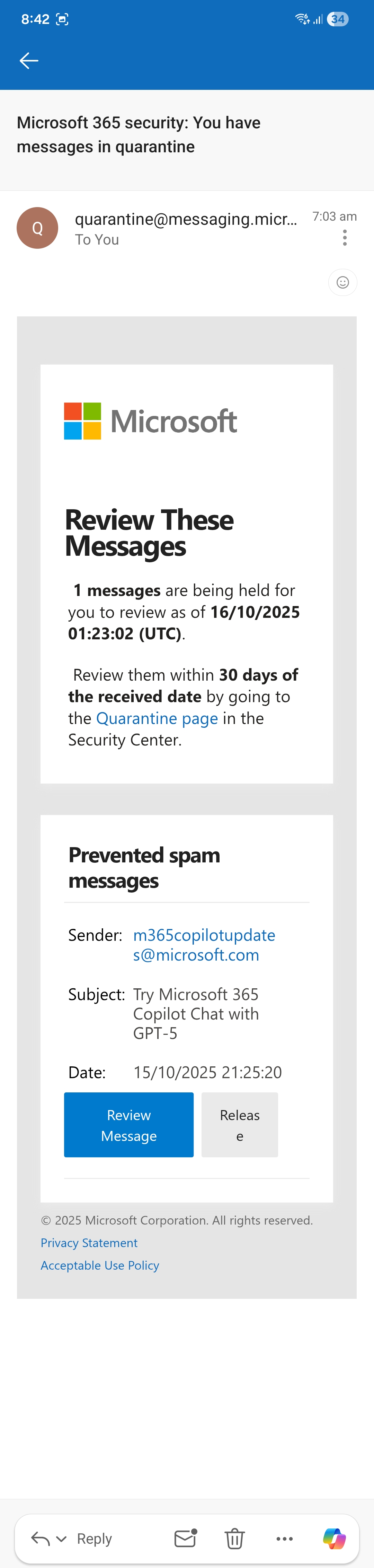Outlook marked Microsoft's Copilot email as spam
