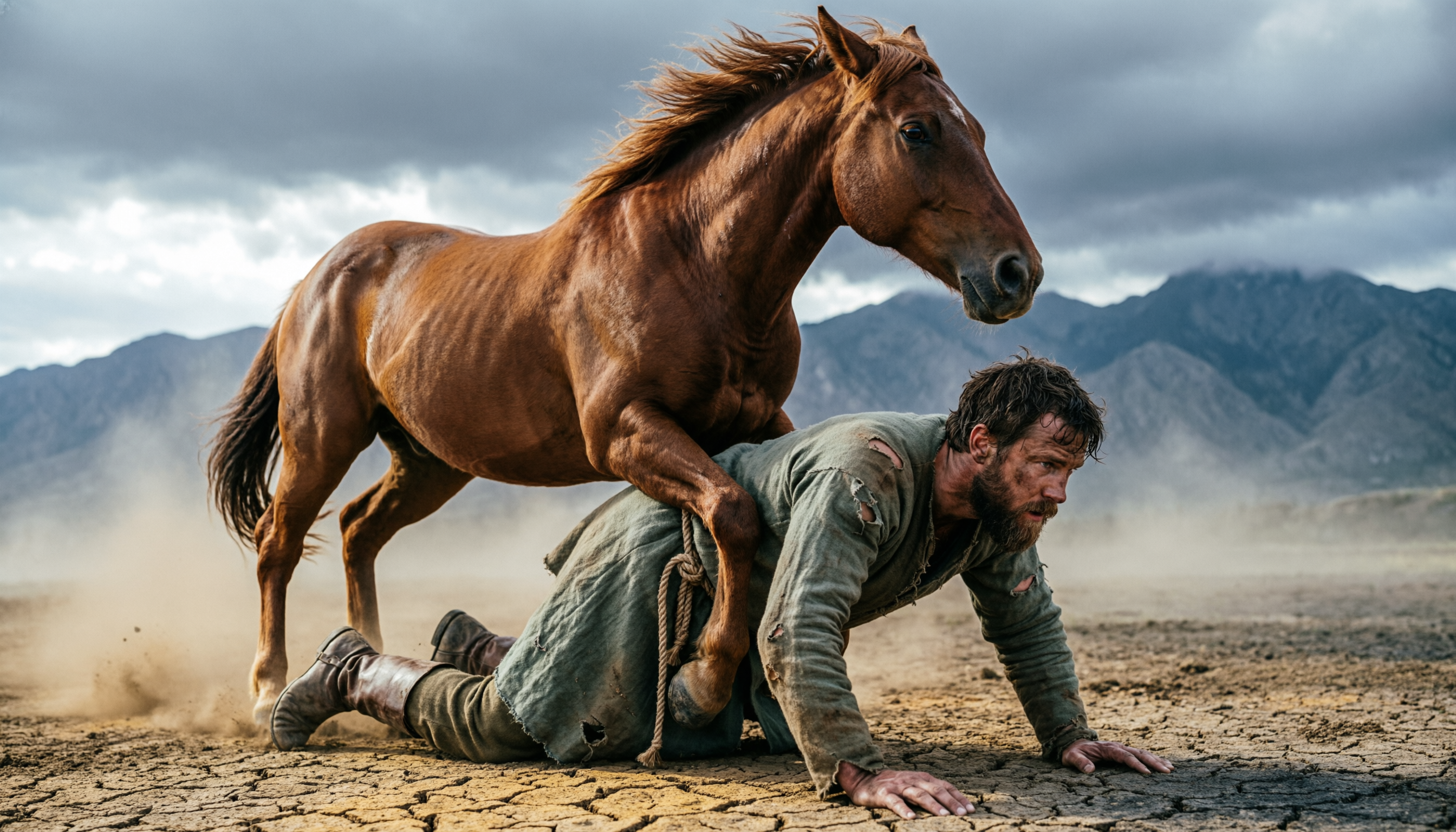 Mid-ground, eye-level composition: A muscular, robust adult brown horse stands proudly, its forelegs heavily pressing between the shoulder blades and spine of a reclining man. Its hind legs are taut, its neck held high, its mane flying against the wind, its nostrils flared, and its eyes sharp and focused, exuding a primal sense of power. The subdued man is a white male, 30-40 years old, his face covered in dust and sweat, his short, messy dark brown hair plastered to his forehead, his thick beard slightly damp; he wears a badly worn, grey-green medieval-style robe, the fabric torn and stained with mud in several places, a thick hemp rope tied around his waist, and scratched ankle-high leather boots; his body is in a push-up position—his palms are pressed hard against the cracked, dry earth, his knuckles white, the veins in his arms bulging, his legs stretched straight back and taut, his toes digging into the ground, his entire torso trembling slightly from the weight.