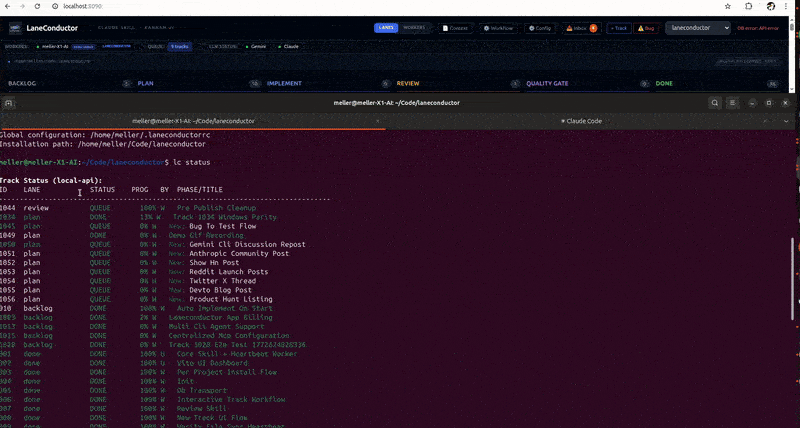 Four ways to use it: - /laneconductor skill commands inside Claude Code (plan, implement, review, brainstorm) - Instruct Gemini CLI the same way — native conductor format support - lc CLI for track management - Worker mode: background daemon that picks up queued tracks autonomously