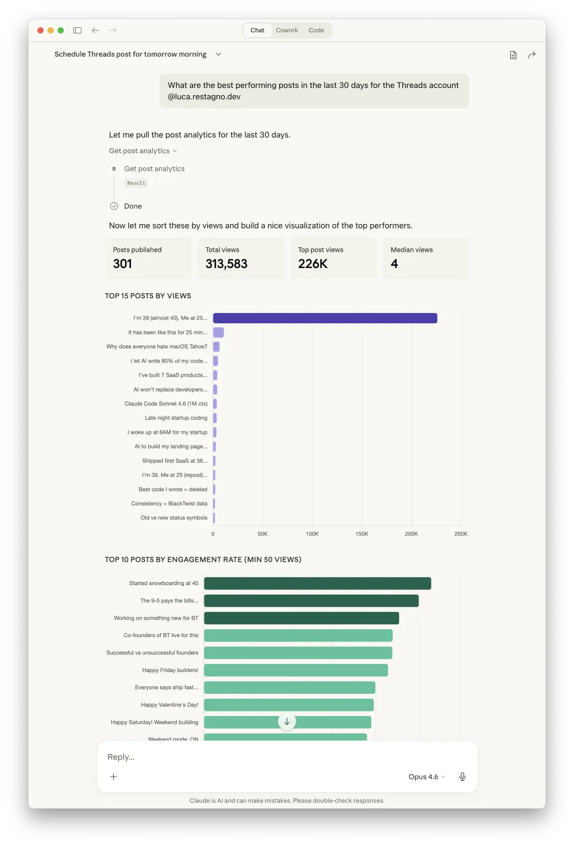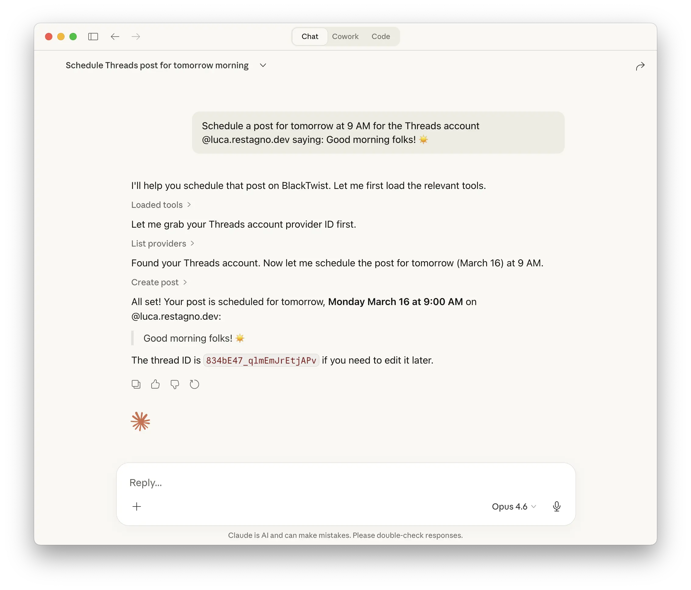 An MCP server that connects to the Threads API through BlackTwist. You can schedule posts, check your analytics, see who engaged with your content, set up automated follow-ups, and more. All through natural language in Claude.